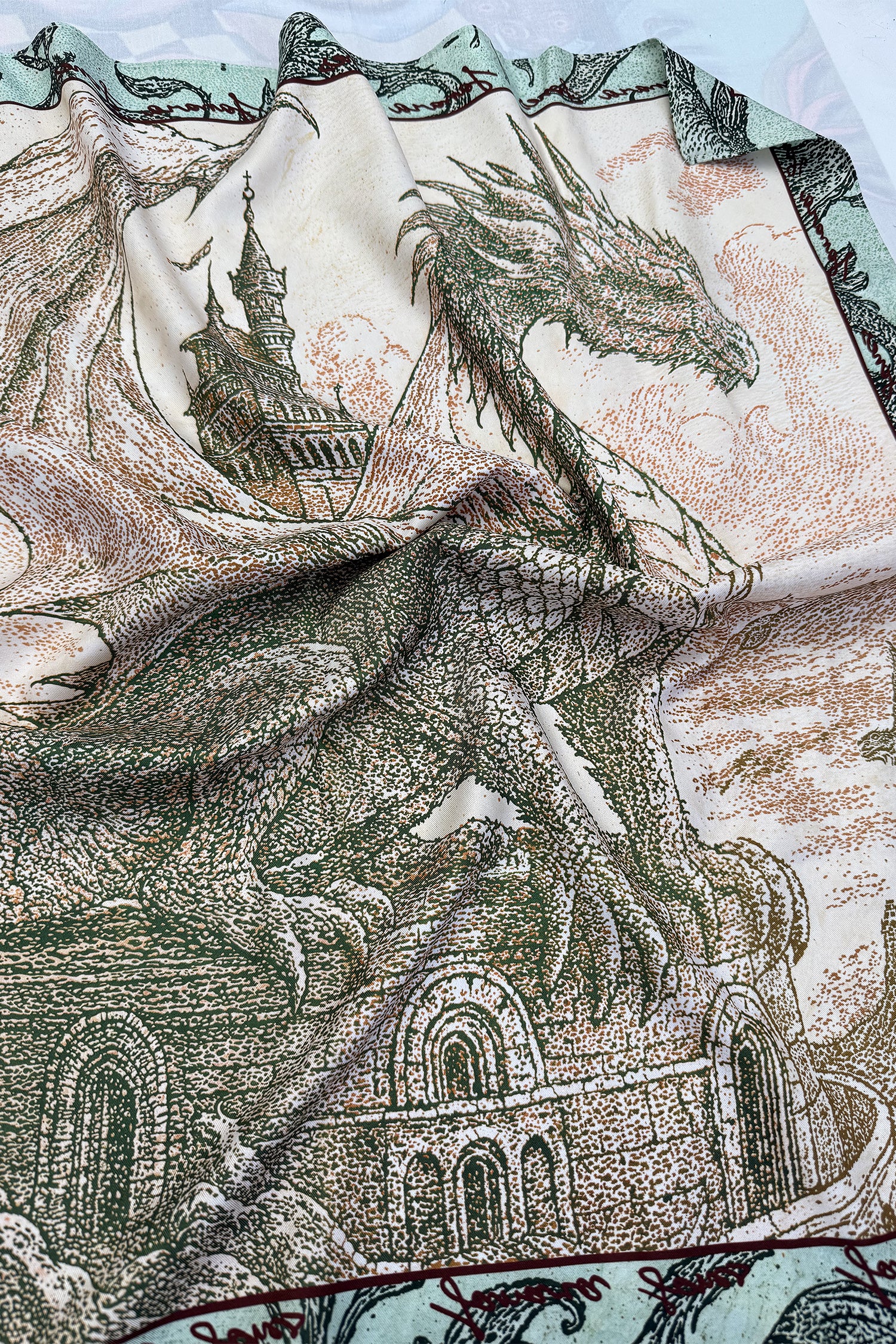 Luxury satin twill scarf featuring an intricate hand-drawn dragon guardian protecting medieval architecture. Forest green mythical creature with detailed scales wraps around ancient towers on cream base, framed by sage botanical border.