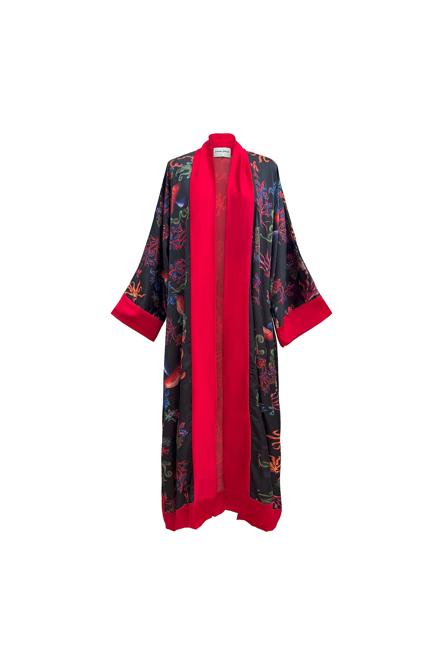 Elevate your style with this exquisite Abaya Kaftan, as masterpiece of elegance and bold contrast. Crafted from premium satin, it features a mesmerizing black base adorned with psycho mushrooms inspired motifs in shades of blue, crimson, and green- evoking the beauty of an underwater garden. A striking scarlet red satin trim and cuffs add a touch of drama and refinement, framing the silhouette with effortless sophistication. The flowing, open-front design allows for graceful movement, making it ideal for both evening wear and luxurious resort styling.