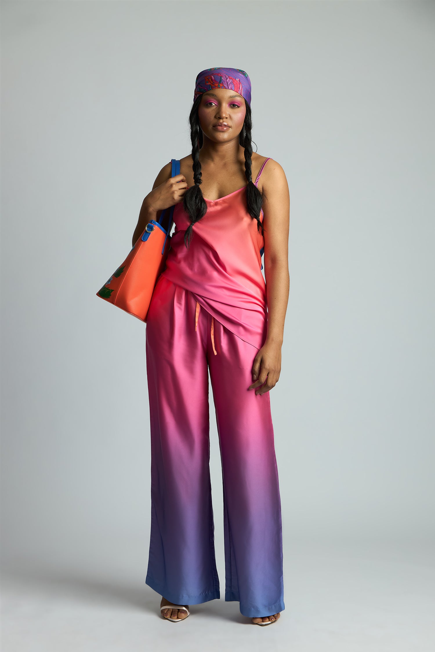 Indulge in effortless elegance with this satin ombre cami top, designed in a striking gradient that flows from fuchsia pink. Crafted from premium armani satin, it drapes beautifully over the body offering a smooth, lustrous finish that catches the light with every movement